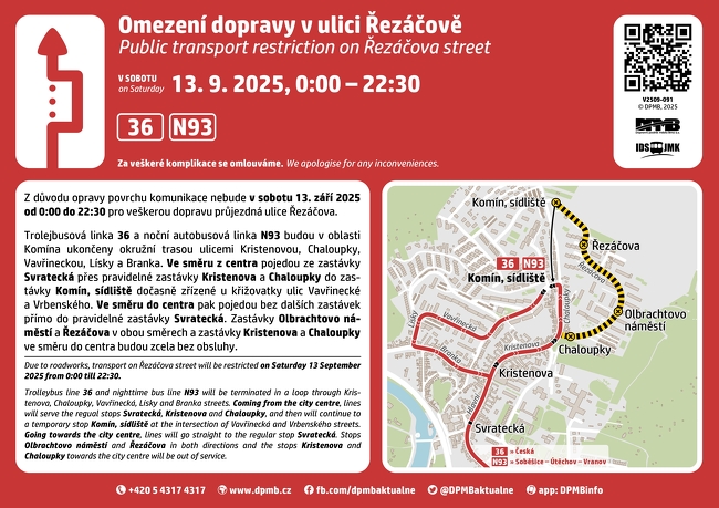 DPMB informuje, že důvodu opravy povrchu komunikace nebude v sobotu 27. září 2025 od 0:00 do 22:30 hod. pro veškerou dopravu průjezdná ulice Řezáčova.