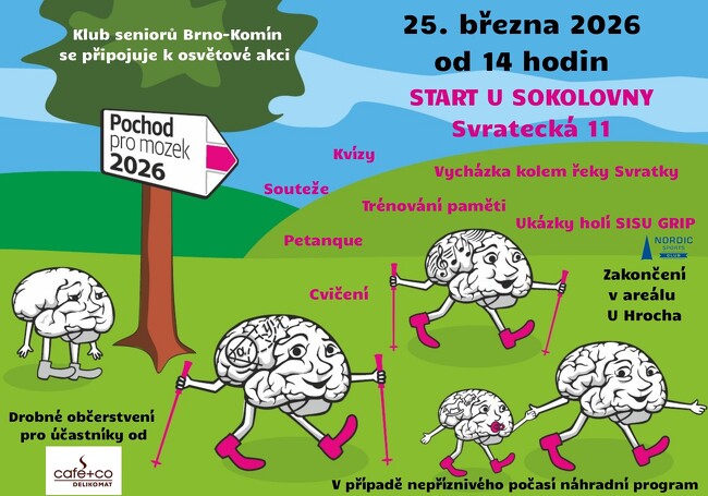 Klub seniorů Brno-Komín se připojuje k osvětové akci POCHOD PRO MOZEK ve středu 25. března 2026 od 14 hodin. Start je u Sokolovny na ulici Svratecká a odsud se jde cyklostezkou až do sportovního areálu U Hrocha, kde pochod končí. Cestou plníte různé úkoly či už paměťové, sportovní aj.